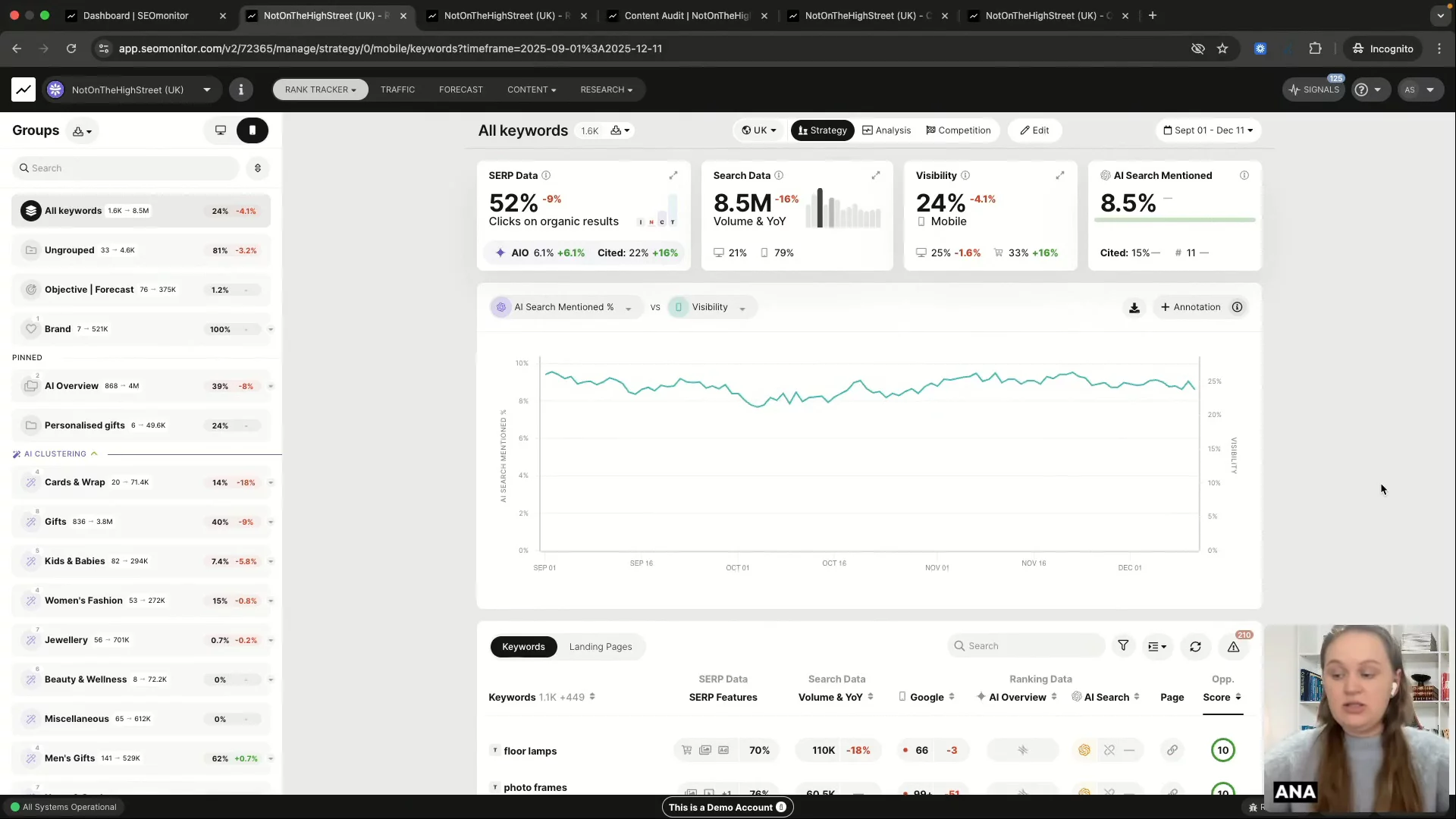 This session walks through the complete diagnostic workflow in SEOmonitor—from understanding what's happening in your market (search volume trends, SERP feature changes, how many users are clicking on organic links) to identifying where you're visible now across Google, AI Overviews, and AI Search, spotting your biggest growth opportunities, and then acting on them through Content Writer.