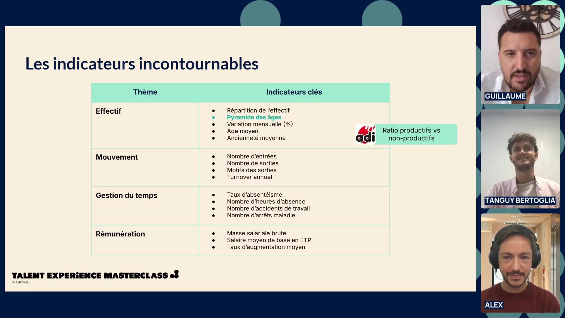 Tanguy Bertogliati, Expert Produit chez Editions Tissot, Guillaume Bertrand, Responsable RH chez ADI Sécurité Incendie et Alexandre Malarewicz, DRH et Cofondateur d’Empowill vous guident pour redonner du sens à vos KPI RH :